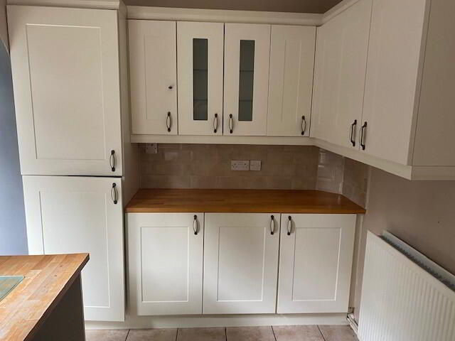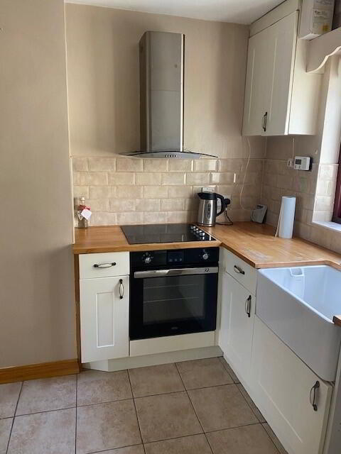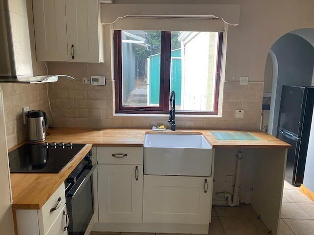 Cream floor tiles, cream shaker-style high and low level unit, integrated electric hob and oven, Belfast-style sink, wood-effect worktops, double radiator, and access to the rear utility space and garden.