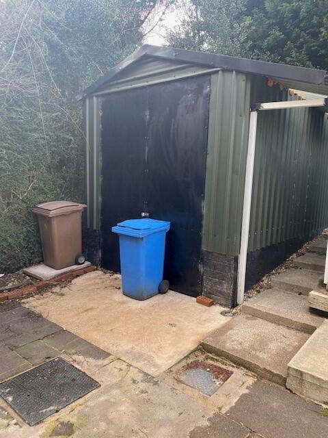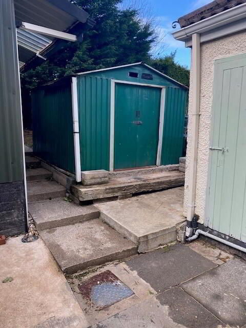 To the front, the property is fully enclosed by a mix of wooden fencing and metal gates. The frontage benefits from a concrete/tarmac pathway with a decorative stone feature. Side access leads to the fully enclosed rear yard, which is paved and further benefits from two storage sheds