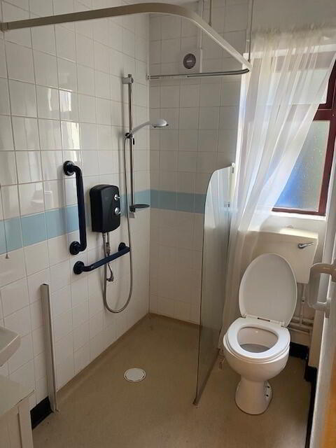 Walk-in shower, pedestal wash basin, low-level WC, fully tiled walls, and non-slip flooring.