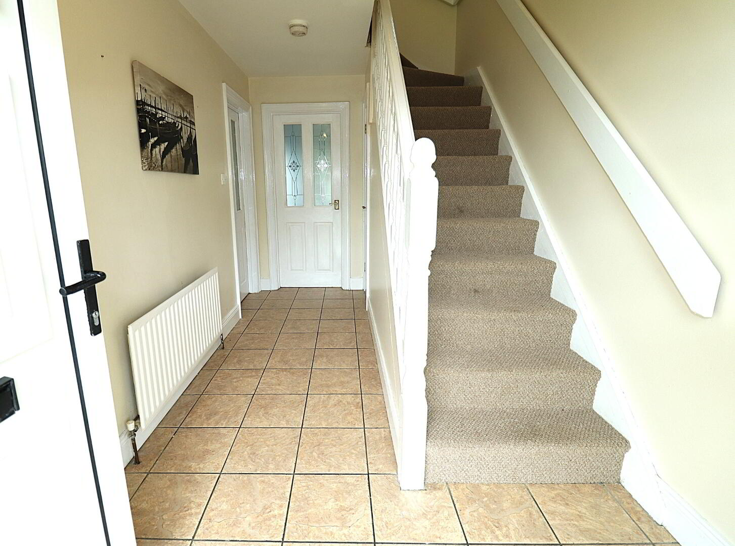 HALLWAY 2.10m x 4.30m Tiled floor, carpet on stairs and single radiator.