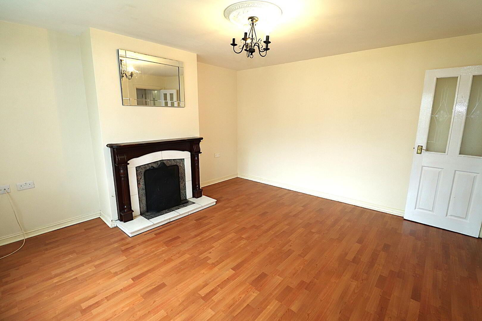 LIVING ROOM 4.20m x 4.00m Laminated floor, vertical blinds, double radiator, open fire with mahogany surround, tiled inset and hearth.